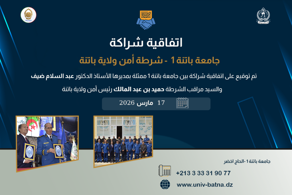 الغرفة الولائية للتجارة والصناعة الأوراس تم امضاء اتفاقية شراكة وتبادل بين جامعة باتنة1 والغرفة الولائية للتجارة والصناعة الأوراس مدتها ثلاث سنوات (2025)