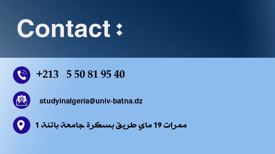 تستقبل جامعة باتنة 1 بالطلبة الدوليين الراغبين في متابعة دراستهم ضمن مختلف التخصصات الأكاديمية، في بيئة علمية وثقافية متميزة تجمع بين الجودة و الإنفتاح